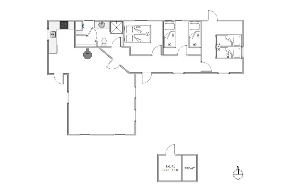 Ein gemütliches etwas zurückliegendes Haus. Die Einrichtung ist geschmackvoll zeigt aber schon Gebrauchsspuren. Die Lage ist ruhig. Das Haus ist von drei Seiten vor Einblick von außen durch Bewuchs der Aussenanalage geschützt. Es hat eine kleine innen liegende Sauna. Das Haus verfügt über drei Schlafzimmer davon zwei mit Einzelbetten und eins mit einem 160×200 cm Doppelbett.