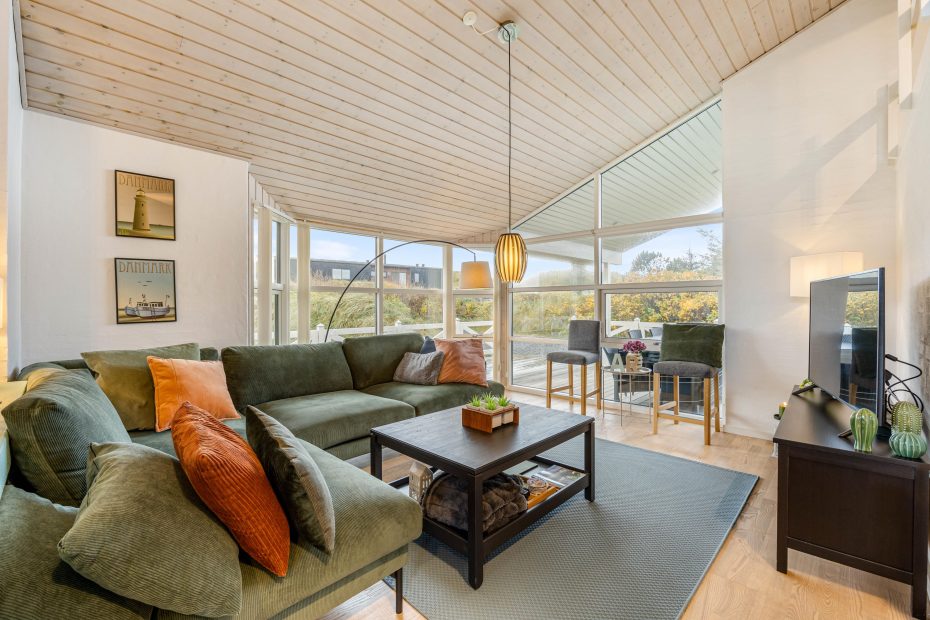 Det store, åbne køkkenalrum er husets hjerte. Her finder I både et godt og veludstyret køkken, et godt spiseområde samt et dejligt sofaafsnit med et flot kig til husets udeområde. Det store rum har højt til loftet og sammen med det flotte lysindfald, får man en god fornemmelse af plads omkring sig samtidig med, at de små hyggekroge skaber rum til fordybelse og nærvær. Når vejret ikke er til at sidde ude, er det helt oplagt at sidde i en god stol i stuen og nyde udsigten til svejende marehalm og forhøjninger i landskabet. På køligere dage er det oplagt at tænde op i husets brændeovn og kigge på flammernes knitren.