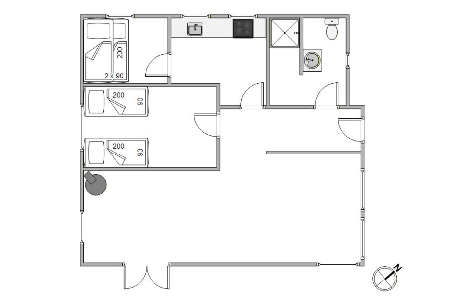 Sommerhuset fordeler sig over 54 m² boligareal med god plads til 4 personer og jeres hund. Huset er indrettet med 2 soverum – det ene med 1 køjeseng og det andet med 1 dobbeltseng – så alle kan få en god nats søvn efter en dejlig dag ved Vesterhavet og den smukke Vestkyst.