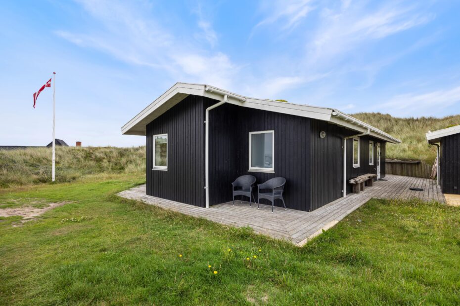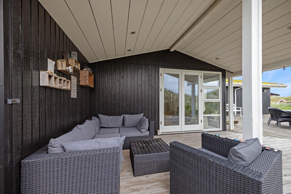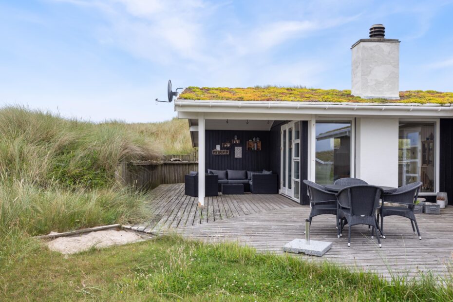 Sommerhuset på sortebærdalen 10 imponerer ikke kun indvendigt. Udenfor på adressen finder I nemlig nogle yderst indbydende arealer, hvor der er rig mulighed for at slappe af og nyde den skønne natur. Den dejlige træterrasse løber hele vejen rundt om huset, hvilket betyder at der mulighed for at nyde solens stråler og den friske luft uanset vind og vejr. Den ene del af terrassen som vender vest ligger godt beskyttet af den foranliggende klit, hvilket giver masser af privatliv. Samtidig kan I også nyde den overdækket terrasse, som giver jer mulighed for at nyde udelivet, på trods af det måske skulle dryppe lidt.