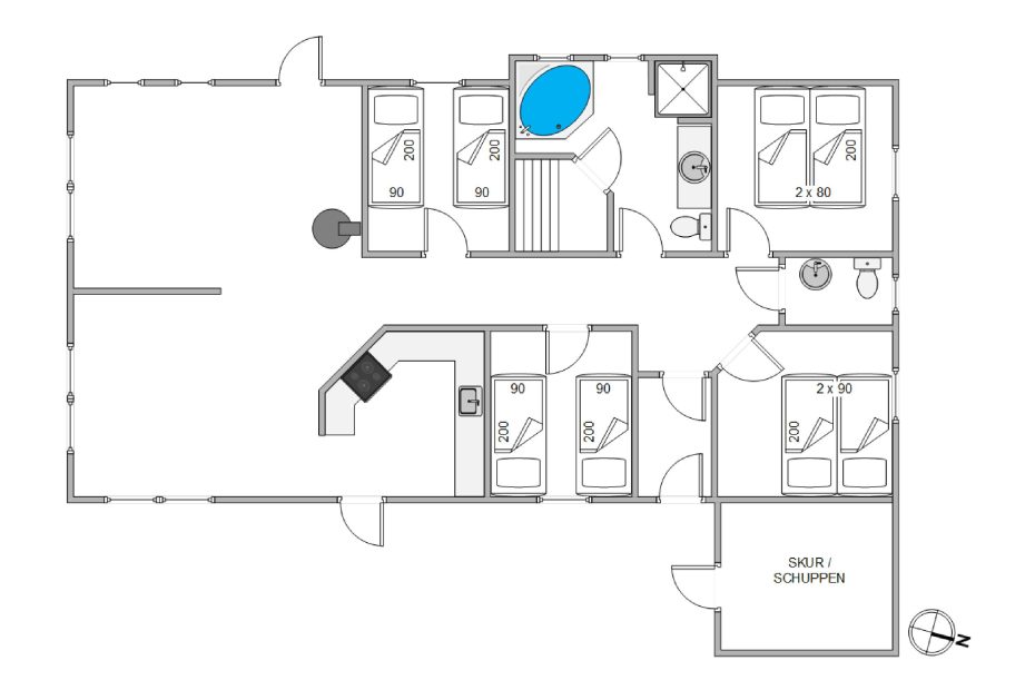 Sommerhuset kan huse op til 8 personer, der kan fordele sig på 4 værelser, hvor 2 af værelserne er med dobbeltseng og de sidste 2 værelser er med 2 enkeltsenge. For at passe til resten af husets størrelse, er sommerhuset udstyret med et stort badeværelse og et ekstra gæstetoilet – Så undgår I de alt for lange køer på morgenerne. Det ene badeværelse gemmer også på nogle dejlige overraskelser. Her finder I nemlig både et spabad og en sauna, så her kan I virkelig nyde ferien og tage et smut i “hjemmewellness”.