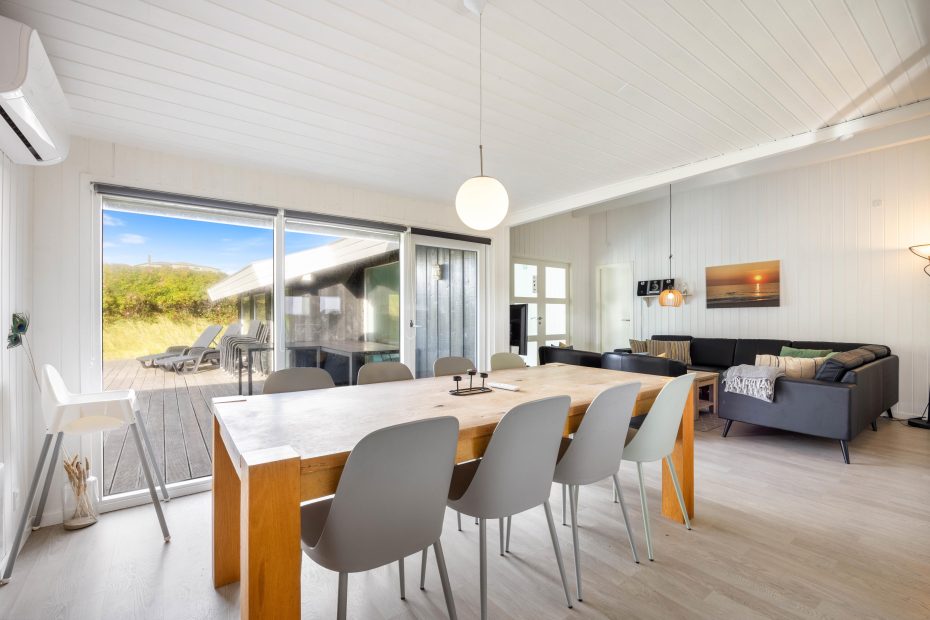 På terrasserne rundt om huset, kan man til enhver tid finde et læ-hjørne, og mod syd er terrassen omgivet af klitter, så man er helt privat og kan nyde solen og lugten af havet, mens børnene gynger eller leger i sandet.
