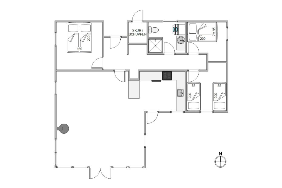 Sommerhuset på 90 kvadratmeter er indrettet med 3 gode soveværelser. Det ene soveværelse er indrettet med en dobbeltseng, det andet er indrettet med 2 enkeltsenge, mens det tredje er indrettet med en etageseng – det er det oplagte værelse til børnene. I sommerhuset har I desuden 1 badeværelse, der er udstyret med gulvvarme.