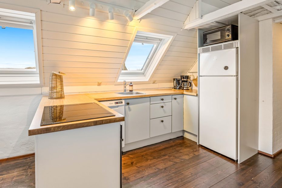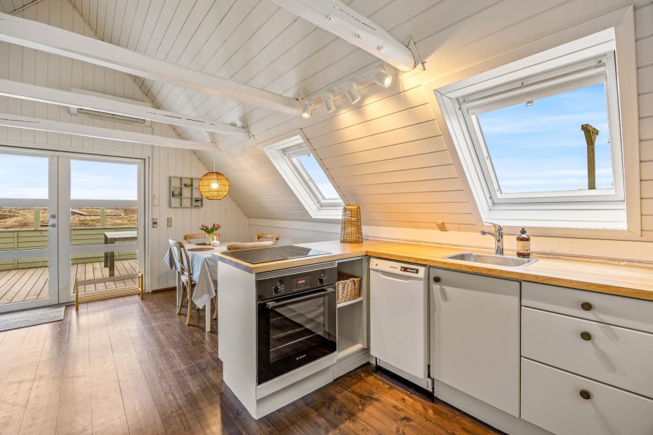 Køkken, stue og spisekrog flyder sammen i ét stort opholdsrum, hvor loftet til kip og de store vinduespartier er med til at sætte deres præg på rummeligheden. Både lys og udsigt strømmer ind ad vinduerne, og det er svært ikke at læne sig tilbage og falde i staver over det beroligende udsyn. Og med den knitrende brændeovn i baggrunden er den afslappende stemning for alvor sikret. Dette giver derfor også mulighed for, at man kan hygge sig sammen imens man laver et lækkert måltid i køkkenet.