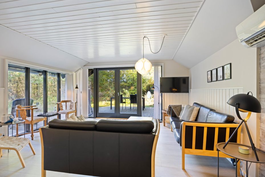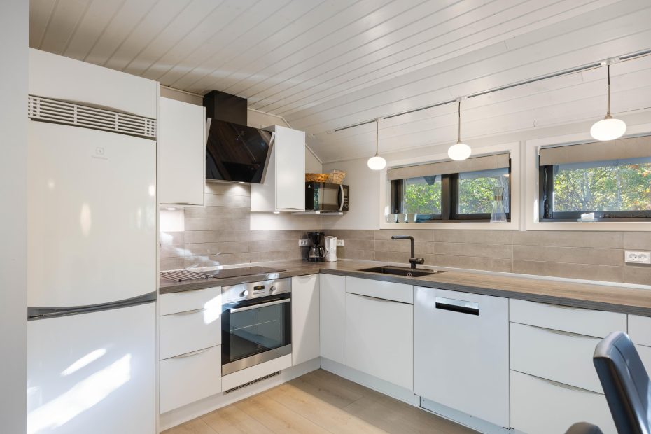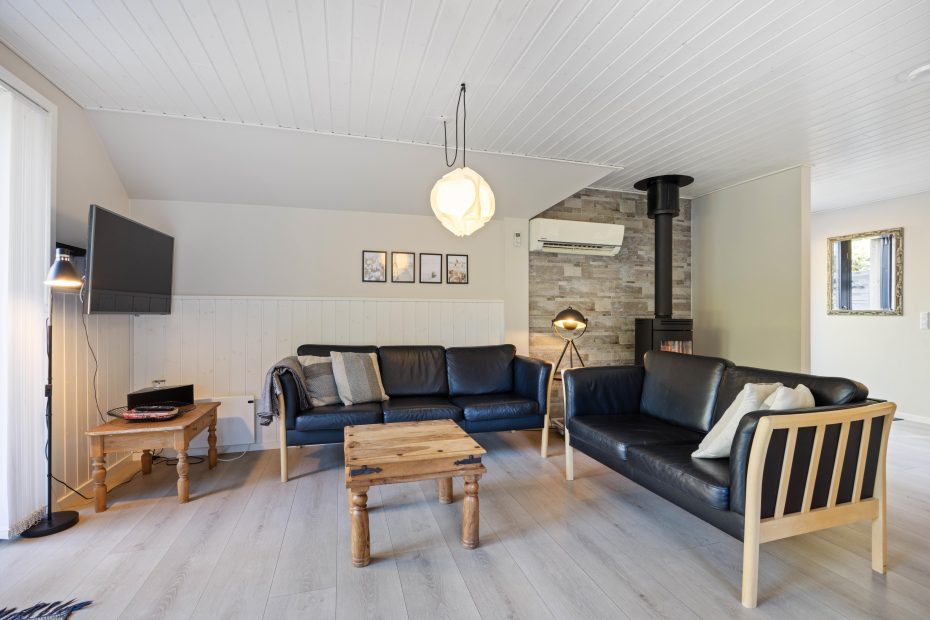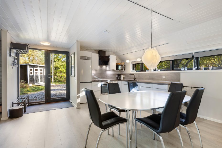 Det lyse og indbydende interiør på Ahornalle 14 skaber en rolig og afslappet atmosfære, hvor I straks vil føle jer hjemme. Det store, åbne opholdsrum forener køkken, spiseområde og stue i ét sammenhængende fællesrum – ideelt til fælles madlavning, hyggelige middage og afslapning foran brændeovnen. Den funktionelle indretning og det gode indeklima gør sommerhuset behageligt og komfortabelt året rundt, uanset om I besøger det i sommermånederne eller til en rolig vinterferie tæt på naturen.