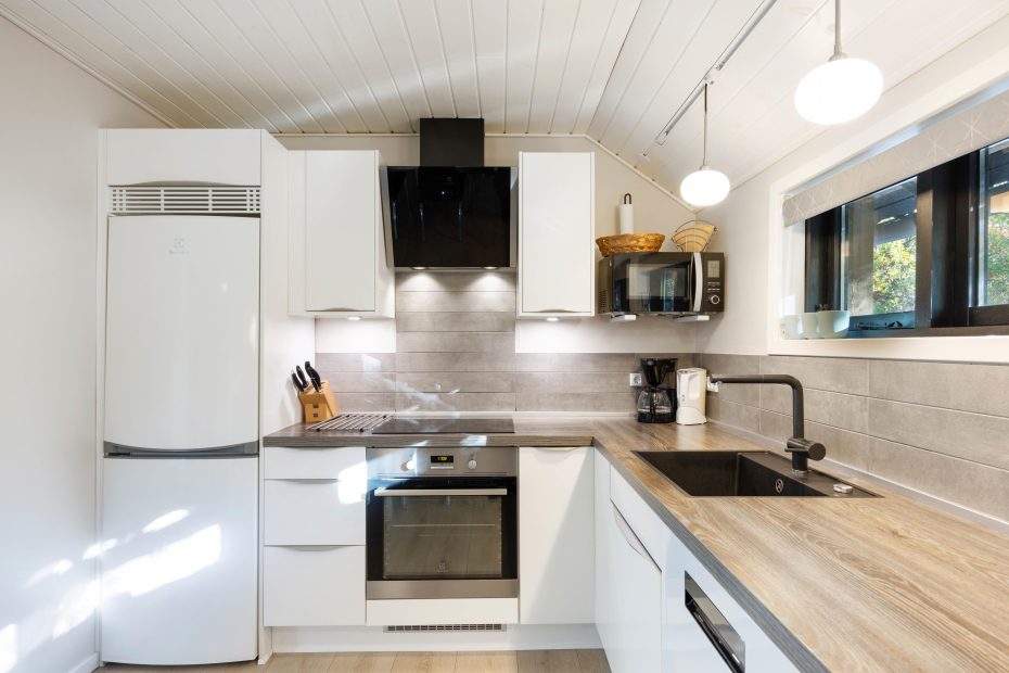 Køleskab, fryser (60 L), microbølgeovn, opvaskemaskine.