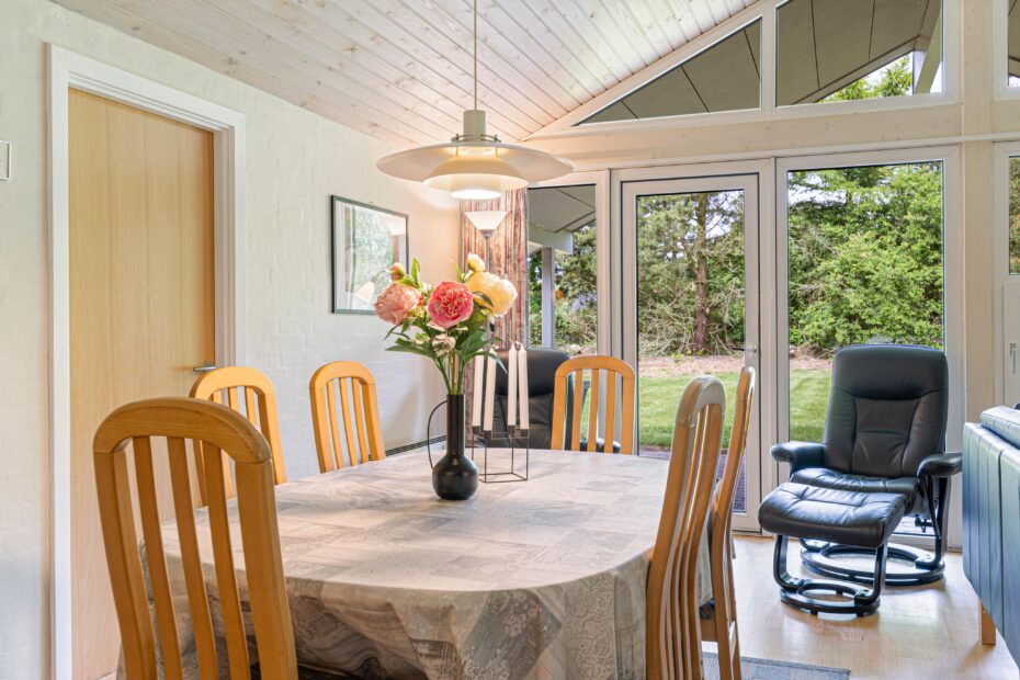 Det åbne køkken-alrum er uden tvivl sommerhusets midtpunkt, og her er der lagt op til mange gode stunder. Det veludstyrede køkken er udstyret med opvaskemaskine, et stort køleskab og alt, hvad man skal bruge til madlavningen. I opholdsstuen kan I hygge jer i den behagelige sofa eller nyde jeres måltider sammen ved spisebordet. Her venter en brændeovn, der kan skabe en hyggelig atmosfære på kølige aftener. Alternativt kan I tænde for den energibesparende luft-til-luft-varmepumpe, som også kan sørge for et behageligt indeklima i opholdsrummet.