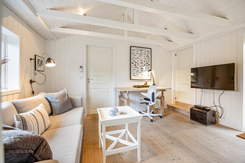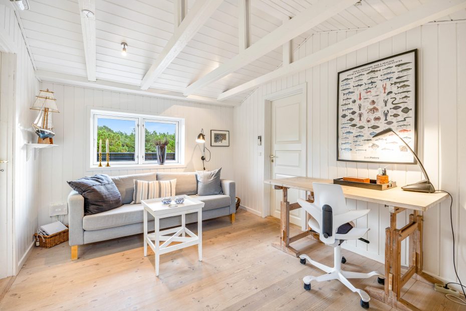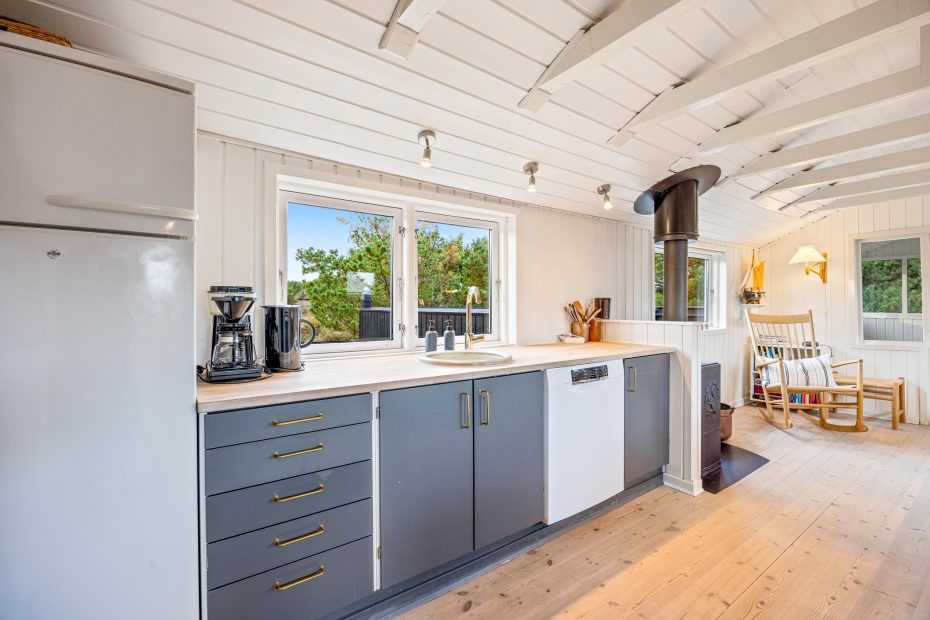 I stuen står brændeovnen, som med sine knitrende flammer altid sørger for, at feriestemningen er i top. I forlængelse af opholdsrummet ligger en hyggelig ekstra stue med masser af vinduer, der inviterer den grønne natur indenfor – det perfekte spot til en friskbrygget kop kaffe og en spændende bog.